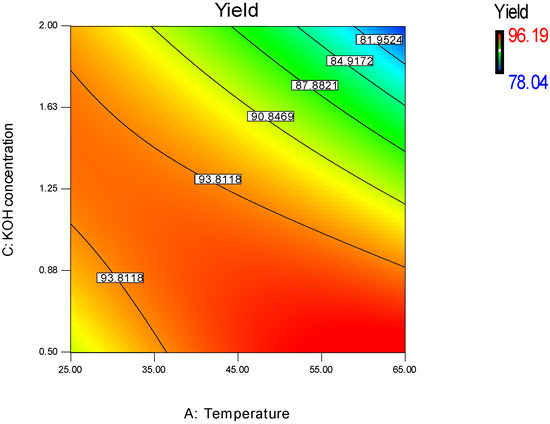 The three-dimensional surface plot (Figure 4) shows that biodiesel yield increases gradually at a transesterification temperature lower than 35 °C, whereas at high temperatures (≥35 °C) and at a catalyst concentration above 1.25%, the yield decreases from 90.07% to 78.98%. Actually, this demonstrates that the excess of KOH results in the formation of soaps through a saponification reaction. Therefore, ester and glycerol emulsification take place, which makes it hard to separate the biodiesel, leading to ester losses and a decrease in the biodiesel yield [24]. However, an insufficient amount of catalyst resulted in the incomplete conversion of triglycerides into the esters.