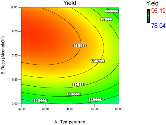 The temperature has a moderately significant effect on the yield with a p-value of 0.0127. The combined effect of the temperature and ratio molar methanol/WFO are illustrated in Figure 5, which shows that at the high molar ratio, the yield increases slowly from 93.93% to 94.15% at low temperature; however, it decreases to 84.41% at the low molar ratio and a high temperature. This can be justified as follows: beyond a certain temperature, alcohol starts to evaporate and slows down the reaction. In addition, during the use of a basic catalyst, the saponification reaction that occurs concurrently with transesterification will be favored beyond certain thresholds of temperature.