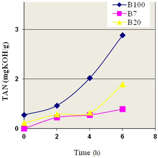 Oxidative stability (OS) is an indication of the resistance to degradation of the fuel due to oxidation during long-term storage, and is of great importance in the context of possible problems with engine parts. Upon oxidation, biodiesel forms products that can lead to many operating issues, such as the formation of deposits, eventually leading to complete failure of the fuel injection equipment (FIE) [58]. The factors that influence the oxidation susceptibility of biodiesel are the fatty acid structure; temperature; presence of certain metals or light, as well as the exposed surface area between biodiesel and air [59,60,61]. Biodiesel produced from WFO via transesterification and its blends with diesel (B7, B20) were oxidized under the conditions previously described, and their degradation was monitored via TAN analysis.