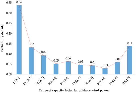 When compared with onshore wind power, the researches on output characteristics of offshore wind power are relatively lagging. Xu et al. [21] proposed an evaluation index used to describe the distribution law of output power of wind power plants. For example, it analyzes the output characteristics of several offshore wind power plants along the South China Sea. As shown in Figure 1, the statistical probability density of offshore wind power demonstrates U-shaped. The x-axis depicts the capacity factor of the wind power plant, which is the unitless ratio of the actual electrical energy output over a given period of time to the maximum possible electrical energy output over that period [22]. The probability density decreases with the increasing of the wind power capacity factor, especially on the interval [0, 0.8]. As the wind power continues to increase, the probability density increases. The share of the wind power capacity factor mainly falls on [0, 0.3] and [0.9, 1], as high as 70%, which clearly shows a trend of polarization. The mean value of capacity factor in major offshore wind power markets in the world is generally between 0.29 and 0.48. In this study, it is equal to 0.35.