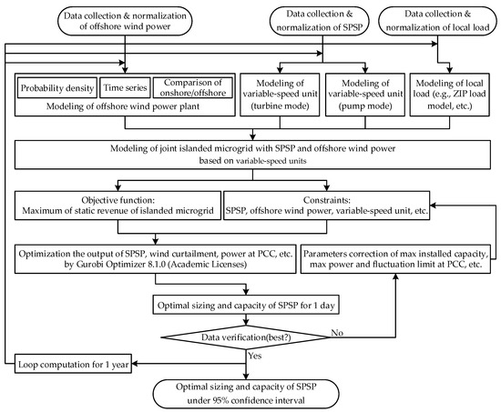 Applying the SPSP with variable-speed units can solve the problems on both offshore wind power accommodation and power supply on islands at the same time [15]. The SPSP is a pure daily pumped storage facility that uses seawater as its lower reservoir. It will be built near the seaside or on a remote island, which can reduce the cost of operation and transmission line construction. Besides, the variable-speed unit can provide high performance on fast power response and wide operating range. While fully considering the characteristics of variable-speed units and smoothness constraints of the transmission line, this paper comes up with an optimal sizing method of SPSP in the connected mode, based on life cycle, energy conversion efficiency, operating cost, capital cost, and electricity price [16].