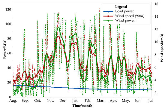 All data regarding the offshore wind power plant and islanded microgrid are taken from Zhuhai City, Guangzhou (located in the South China Sea for latitude 21.95° and longitude 113.75°). The total installed capacity of the wind power plant is 120 MW and the capacity factor is 36%. The maximum daily load of the islanded microgrid is 18 MW and the average daily load factor is 0.693, as shown in Figure 5. For better visualization, the statistics method with locally weighted scatterplot smoothing (Lowess = 0.05) is used for graph smoothing in Figure 5.