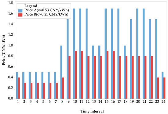 It can be seen that the installed capacity and electrical energy revenue accounts for the largest proportion of total revenue. Moreover, electrical energy revenue is the major variable revenue. It drives the SPSP participating in peaking regulation as much as possible: more pumping and generating is in demand. Price is a key factor. Meanwhile, the larger the price difference, the higher the total revenue. For example, there are two prices that are shown in Figure 6. The standard deviation for price A (0.53 CNY/kWh) is greater than B (0.25 CNY/kWh). If price B (red) is applied, then the final optimal sizing of SPSP is equal to zero, which means that the SPSP is uneconomical when the price is unfriendly. After changing the different limit settings, the optimal installed capacity and maximum revenue can be obtained under corresponding conditions, so the calculations will not be covered again here.