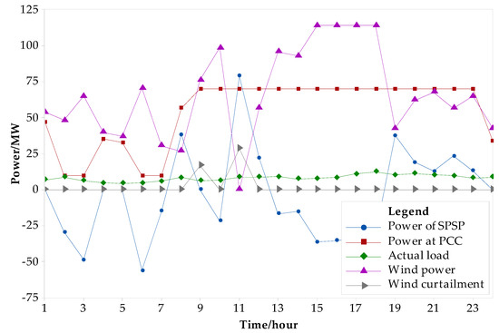 Figure 7 is an operation diagram after calculation on a typical day (August 29th). The preconditions are as follows: the upper limit of power at PCC is 70 MW, the upper limit of fluctuation at PCC is 35%, and the upper limit of the installed capacity of SPSP is 200 MW. It can be seen that the daily load is relatively stable all day. The average daily output power of offshore wind power plant is relatively high, reaching a high level of above 0.6 pu from 9:00 to 23:00. However, from 11:00 to 12:00, a local minimum value of wind power appears, and it suddenly drops to 0.1 pu. Under the constraints of power and fluctuation, the randomness of offshore wind power causes severe wind curtailment. Fortunately, applying SPSP makes the wind curtailment reduce from 207 MWh to 45 MWh.