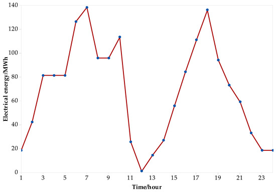 Figure 8 shows the timing diagram of the schedulable electrical energy of the upper reservoir on the same day with the same parameter settings. The SPSP absorbs a large amount of “cheap” wind energy during the early morning hours or the time of wind power excess. The SPSP maximizes the electrical energy revenue through cyclic regulation [33]. Finally, the SPSP has an optimal installed capacity of 78 MW and a maximum electrical energy of 136 MWh under the current scenario.