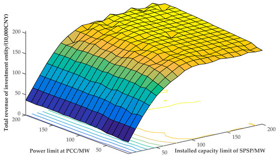 The revenue after applying the SPSP is mainly reflected in the installed capacity revenue and the electrical energy revenue through the different time-of-use tariffs. Coordinating with the offshore wind power plant, the SPSP is used to maximize the economic benefits of the islanded microgrid [24]. On this basis, the peaking cost that is caused by renewable energy fluctuation is specifically considered. Therefore, the total static revenues, respectively, include installed capacity revenue, electrical energy revenue, capital cost, energy losses cost, operating cost, and peaking cost. Finally, the objective function to maximize the static revenue can be expressed, as follows: