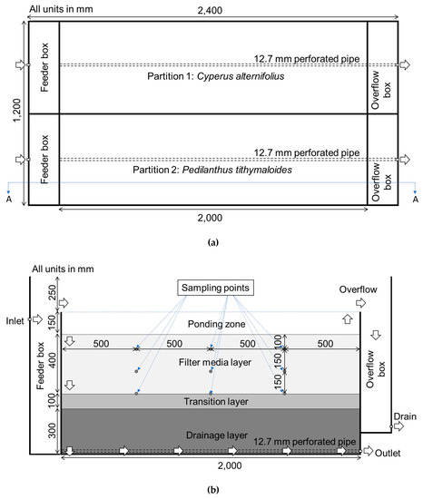(a) Plan view and (b) cross-section (A-A) of the box biofiltration system.