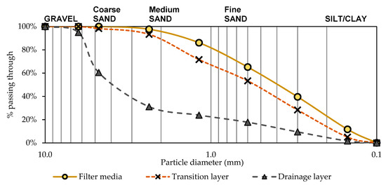 where D15 and D85 are the 15th and 85th percentile of passing particle size. To determine the distribution of particle size, sieve analysis was conducted following ASTM C136 [31]. Figure 2 illustrates the particle size distribution from sieve analysis of the filter media, transition, and drainage layers used in the box biofiltration system. It is worth mentioning that both Equations (1) and (2) were satisfied for the proposed materials to be used for each layer. In addition, it was decided to consider 200 mm/hr as the minimum targeted infiltration rate value, following the recommendation by FAWB [17].