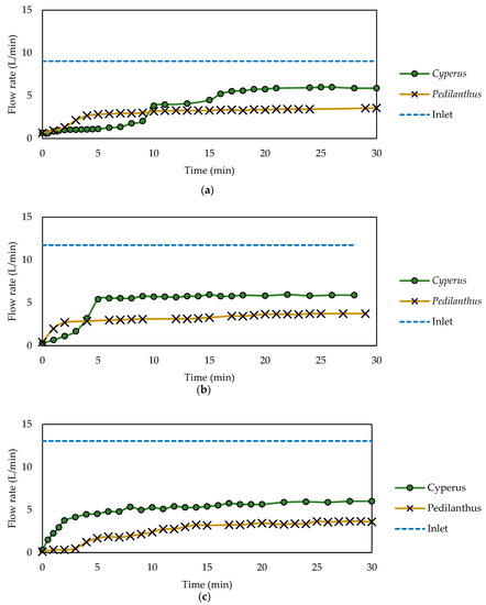Inlet and outlet flow rates (L/min) for both Cyperus and Pedilanthus plants across: (a) Round 1, (b) round 2, and (c) round 3 of experiment.