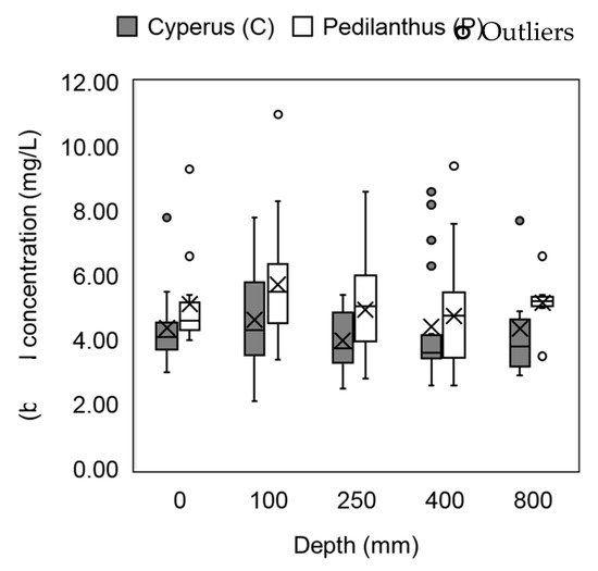Figure 6 represents box plots of TP concentration in influent and effluent with respect to the depth. There are six outliers from 144 data points, thus leaving 138 data points for further discussion. The descriptive statistics for TP concentration (excluding the outliers) are summarized in Table 4. Cyperus and Pedilanthus achieved mean overall CRE of 67.3% and 62.5% in TP removal, respectively. As it can be seen, Cyperus plant box was marginally more effective in TP removal than Pedilanthus plant box. It is worth mentioning that TP removal was significantly better than TN removal due to the fact that soil media contributes to the TP adsorption, while it is not very effective in TN removal [48,49,50]. Since the performance of Cyperus and Pedilanthus in TP removal was not significantly different, it was concluded that the plant uptake should have not contribute much to the TP removal [51]. On the other hand, the TP removal showed a positive correlation with the depth of the filter media. Table 4 shows an increasing CRE for both Cyperus (42.9% to 51.9%) and Pedilanthus (27.5% to 50.0%) between 100–400 mm depth. This result satisfied the hypothesis that soil media play a bigger role in removing TP than the plant since the plants root was not developed at 100 mm depth of filter media layer. It was observed that the TP removal of the present study are matching with the ones reported in literature for field-scale biofiltration systems (e.g., 60% [52], 65% [9], and 17–92% [53]).