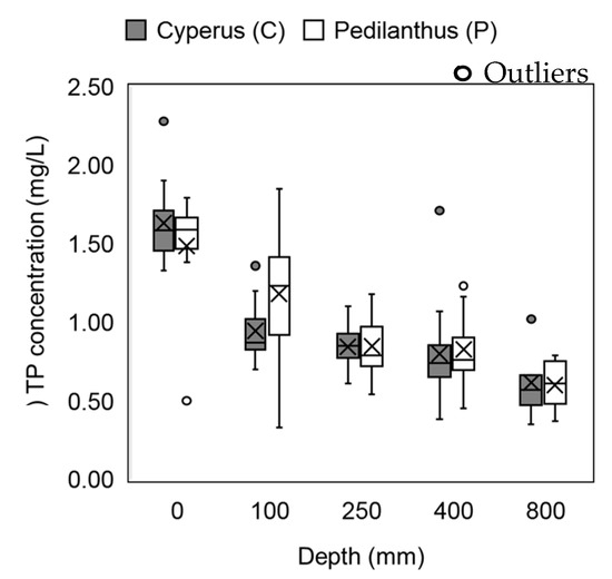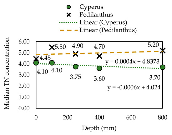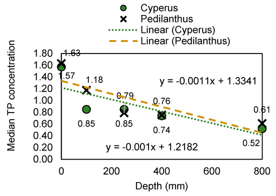 Figure 7 represents median TP concentrations as a function of depth using lines of best fit. Median TP concentrations decreased sharply (with a gradient of −0.0011 and −0.0010 for Pedilanthus and Cyperus, respectively) with an increase in depth. In comparison with the gradient produced from median TN concentration (see Figure 5), TP gradient was one order of magnitude higher. Thus, it was concluded that TP concentrations decrease with increasing depth more significantly than TN concentrations.