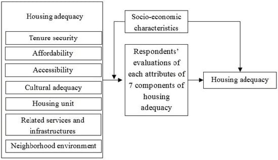 Housing adequacy is usually based on a complexity of subjective and objective parameters associated with individuals’ previous experience, cultural values, personal attributes, perceptions, aspirations, goals, and needs as well as generally defined and acceptable standards [1]. The adequacy level is a function of how housing attributes are perceived by an individual and the standard reference to which such attributes are compared. This can be demonstrated by the fact that a residential environment might be perceived by some people as being highly adequate, while for others, it may be inadequate [19]. Thus, the housing adequacy as a contextual conception has direct association with individuals’ socioeconomic characteristics [40]. The conceptual framework is shown in Figure 1.