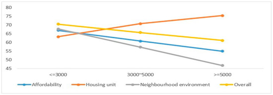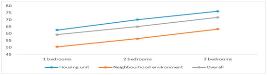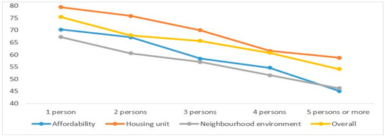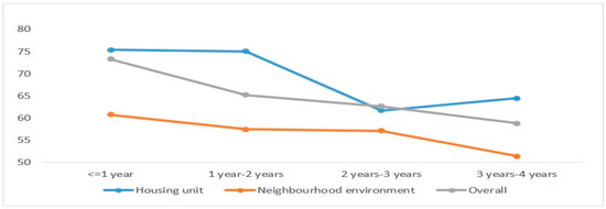 Further analysis was conducted to explore the significant effect of these socioeconomic characteristics (e.g., age, education, income, number of family members, residence duration, and housing type) on the overall adequacy level and its components. According to Figure 3, aged respondents perceived a higher adequacy level towards the neighborhood environment than younger respondents. As shown in Figure 4, the well-educated respondents were likely to have lower perceived adequacy level towards neighborhood environment than less-educated respondents. This might indicate that the neighborhood environment of PRH has not sufficiently satisfied the needs of well-educated respondents, but meets the requirements of less-educated respondents. Meanwhile, the well-educated respondents’ affordability was obviously higher than less-educated respondents. Higher education might imply higher income. With regard to income, as shown in Figure 5, higher-income respondents, with an implied better situation of affordability, might have higher requirements on the aspects of the housing unit and neighborhood environment than lower-income respondents. Similarly, as shown in Figure 6, it can be said that respondents with more family members perceived lower adequacy levels in the aspects of affordability, housing unit, and neighborhood environment and the overall residential environment. Figure 7 indicates that larger housing size can significantly improve the adequacy level of the residential environment. Larger housing not only increases the adequacy level of the overall residential environment, but also the adequacy level of the housing unit and neighborhood environment, while as shown in Figure 8, Fespondents with longer residence duration might perceive a lower adequacy level regarding the housing unit, neighborhood environment, and overall residential environment.