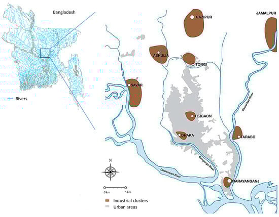 Figure 1. Location of textile industrial areas in Dhaka (adapted from [10]).