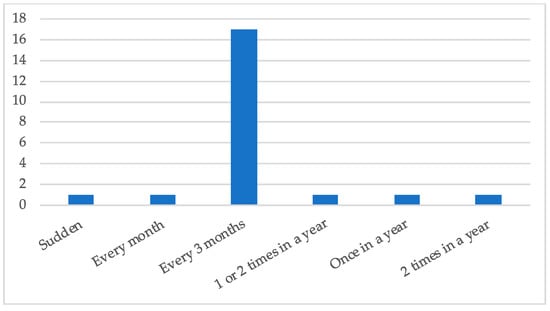 It is often pointed out that monitoring and enforcement by the Department of Environment (DoE) are insufficient. According to the results shown in Table 2, 22 out of 23 companies answered that they have been inspected by the DoE. In the subsequent question, only two companies answered that they have ever been penalized by DoE. This seems to suggest that the responding companies are “clean”. However, Figure 4 shows that the DoE’s monitoring is done on a regular basis, mostly at three-month intervals. Therefore, the companies were likely not caught because they knew in advance of the DoE’s inspection and could prepare the ETP, making it operational before the visit. This corresponds to the interview results of Belal [4]: “The ETP is there but the cost of running it is not feasible and there is no monitoring environment. So, you can set up infrastructure but that will never work. Everybody has a way of knowing when the next inspection will be held.” The amounts of the fines reported by the two penalized companies in our survey were 270,400 BDT and 400,000 BDT. This is within the range of the fines reported by Haque [13]. Even if a factory is fined an average of 1,000,000 BDT twice each year, it would still be more economical to pay the fine rather than running a wastewater treatment plant [20]. So, it was a reasonable transaction for the two penalized companies to pay the fines.