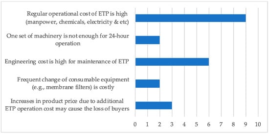 As already noted, non-compliance is more economical for companies than regularly operating an ETP. Table 1 shows the yearly operational costs of ETPs. The mean cost of 13.9 million BDT among the participating companies is almost the same as the average annual operational cost of 13.3 million BDT previously reported for an ETP with around 50 m3/h capacity [13]. The correlation between the yearly operational cost and quantity of treatment per day was 0.54 (p-value = 0.05681). This correlation suggests that more effluent production results in a higher operational cost. The question is whether it is financially feasible or not. Figure 5 shows the top ranked response to the question about barriers to and difficulties in ETP operation, and Figure 6 shows the three highest ranked responses. Based on these results, the major barriers in ETP operation seem to be high running costs and high engineering costs for maintenance. However, the responses related to financial solvency for ETP operation shown in Figure 7 suggest that about 70% of the responding companies did not find the operation to be much of a financial burden. These companies are relatively big, so this tendency may not apply to small companies. But it is worth knowing that financial solvency seems to be regarded by the companies as more or less a manageable problem.