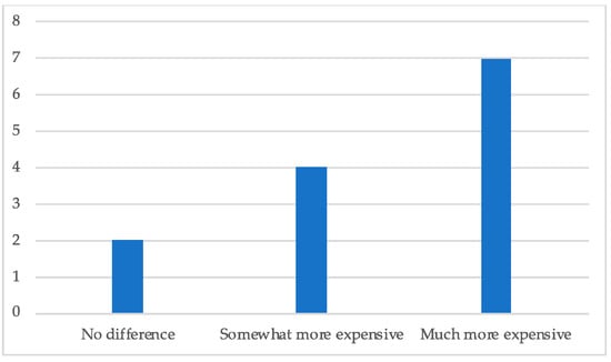 Aside from non-compliance in ETP operation, there are many companies without an ETP altogether. Belal and Roberts [17] reported that among the top 100 companies listed on the Dhaka Stock Exchange, only five of them disclosed having ETPs. Figure 8 depicts the countries of origin of the ETPs. As shown, all were imported from abroad. In Table 1, which shows installation cost and import cost, some companies could provide only the installation cost and some could provide only the total cost of installation and importation. Thus, the descriptive statistics are not consistent with each other. In cases where both the installation and import costs were listed, the sum calculated was the estimation of total cost. Figure 9 shows the financial solvency for ETP installation. About 70% of the responding companies seemed to feel that ETP installation is financially manageable. Figure 10 and Figure 11 show the responses about the barriers to and difficulties in ETP installation. These Figures suggest that the dominant barriers to ETP installation are at the import stage, rather than the construction stage. They indicate that companies have to import ETPs because they are not available locally. The companies also have to find the information about purchasing ETPs for themselves. In some cases, where the companies had recommendations from foreign buyers, imported ETPs from European countries were suggested. Figure 12 shows how the price differed when the responding companies were given suggestions by buyers about which ETPs to purchase as compared to when they obtained the information for themselves. In most cases, the price of a recommended ETP was higher than that found with their own search. Along with the unavailability of ETPs locally, the results suggest that the companies had to choose their ETPs from among limited options and the additional cost due to import fees tends to cause more financial burdens for the companies.