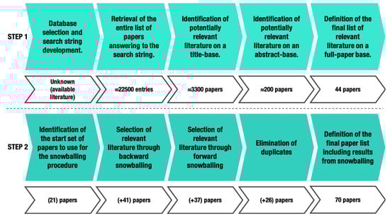 The second step aimed at spotlighting specific MCDM methods in the field of PSS, through backward and forward snowballing. The author first made use of the reference list of a paper to identify additional papers relevant for the given research objective (backward snowballing). In a later stage, the citations to the paper were also analyzed to ensure a broader coverage of the literature (forward snowballing). The start set of papers to use for the snowballing procedure was selected from the list obtained in step one, having care to include papers coming from different communities, as well as different publishers, years, and authors. As inclusion criteria, only those contributions explicitly referring to sustainability in the proposed methodology (e.g., using sustainability-related criteria in the MCDM exercise) were retained. A total of 26 papers were added to the final paper list for analysis, for a total of 70 contributions.