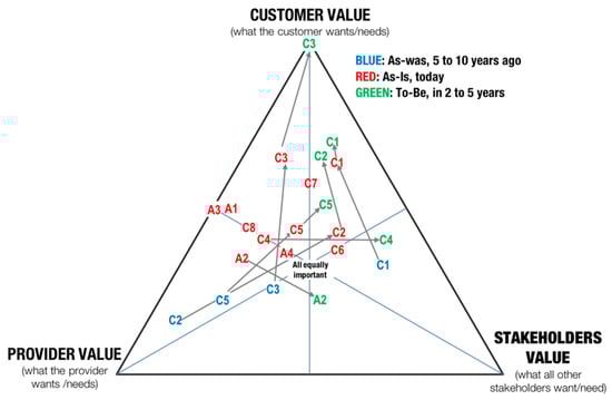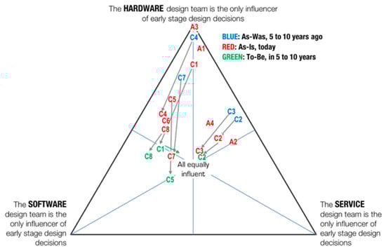 The empirical study further investigated what aspects of “value” are used to drive early-stage design decision making at the company. Additionally, in this case, the interview respondents were asked to formalize their answers by indicating a specific point on the Ternary plot (Figure 3). The edges of the new plot referred to three “areas” of value in the organization, which were customer value (what the customer wants or needs), provider value (the strategic goals of the provider organization), and stakeholder value (what other actors, including suppliers, governmental organizations or local communities might want or need). The red dots featured in Figure 3 show a good balance between these three main areas, with customer value considerations being found to be a dominant argument to “sell” a design concept within the cross-functional team. Some of the respondents pinpointed, also, where the company was positioned in the past (blue dots) and where it is directed in the near future (green dots). These trajectories reveal a growing awareness about the need for including a diverse and multifaced mix of decision-making criteria for early-stage design. While in the past early stage decisions were dominated mostly by internal considerations (revenue, profit, margins, commonality in manufacturing, and more), there is a need for proxies that are able to picture, with more granularity, what creates value for the customers and the broad range of stakeholders of the system.