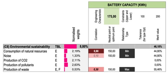 Figure 5 shows an extract from the CODA matrix at the intersection of “battery capacity” (expressed in kilowatt-hour) and five environmental-related value criteria. A larger capacity was strongly correlated with the consumption of natural resources (e.g., the lithium in the battery). A preferred direction to increase the value for sustainability-aware customers is to realize smaller batteries with less material per unit. At the same time, the size of the battery shall be also minimized to produce comparably less noise than larger ones. Capacity is also inversely correlated with waste. Electrical load carriers are typically recharged after every loading-unloading cycle in the construction site, which is smaller batteries discharge more than large ones during a cycle. A deeper depth-of-discharge translates into a shorter life cycle for the batteries, which need to be replaced more often producing more waste (under the assumption that the battery cannot be fully recycled).