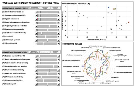 The last step is dedicated to the visualization of the design merit scores obtained from the CODA matrix. In order to facilitate discussion and negotiation among the team members, the results are displayed in an ad-hoc environment based on the importance—performance analysis (IPA) approach [51]. IPA features a two-dimensional map, with provider value on the x-axis and customer value on the y-axis. The main aim is to highlight highly “meritable” (i.e., valuable and sustainable) concepts, as well as solutions that are worth additional analysis and modifications to increase their merit along one of the axes. Each design can be further selected in the IPA matrix, and the team can benchmark it against other proposals, with a higher level of granularity. In this task, spider diagrams and parallel coordinates have emerged as preferred means to communicate the value contribution of a design alternative at the decision gate, highlighting strengths and weaknesses from a life cycle perspective and spotlighting integration opportunities. In the environment, decision makers can then jump back and forth between a system-level view and a more fine-grained, component-level view. This process is intended to facilitate the recognition of “patterns of behavior” to an expert eye, while maintaining the link with specific features of the PSS solution. Based on this data, the team can then deliberate on the opportunity to select a PSS design concept for further analysis, or to iterate the process in the search for better solutions. The team might choose to test the value and sustainability contribution of a set of PSS solutions by varying the rank-weights of the different value criteria, creating a new VCS. At the same time, they may intervene to modify specific EC to generate and test new PSS concepts. Additionally, they invest time to gather input from the PSS network, raising the level of maturity of the knowledge collected in the IBIS map.