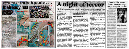 - Silvera, J. A Night of Terror: Chilean-Jamaican Couple Relive Massive Earthquake. Gleaner, 1 March 2010; A3. [Google Scholar]