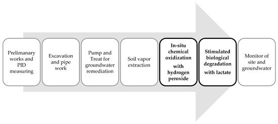 To achieve the 95% reduction of the contamination load, two different remediation alternatives were proposed. A first remediation alternative combining several remediation techniques (Figure 1) was elaborated. In this first alternative, in-situ chemical oxidization (ISCO) is paired with soil vapor extraction (SVE) as the main techniques to reduce the contamination load. This first alternative will be referred to as the “chemical alternative” in this paper. Due to the urban layout of the sewer system and the cellars beneath the adjacent houses to the site, the use of the ozone generator for ISCO would potentially lead to the evaporation of ozone in the homes of the nearby residents. This vapor, if too concentrated, could have an impact on the health of the local residents [16]. When starting the remediation works, PID (photoionization detector) measurements will be performed to test whether the concentrations of evaporated ozone in the houses of the nearby residents is not harmful [16].