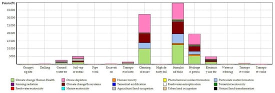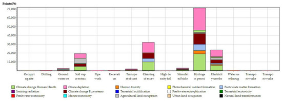 The results of the LCA for the natural remediation alternative indicate that the use of hydrogen peroxide still accounts for an important share of the environmental impact (Figure 3). An additional process contributing significantly to the environmental impact of the natural remediation alternative is the cleaning of the excavated soil. The use of stimulated biological degradation has the largest environmental impact within this alternative due to the injection of a considerable amount of the organic carbon source (Table 1). When we look at the midpoint categories, we see that both remediation alternatives mainly contribute to three environmental effects, namely climate change, fossil depletion and particular matter formation (Figure 2 and Figure 3).