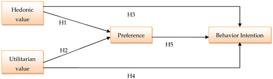 Consumer values have shown to positively influence consumer preferences and satisfaction [35,36]. Some researchers believe that consumer values are linked to consumer preferences as well as future consumer intention [37,38]. In some consumer studies, the role of preference seems to play an important part in future behavior intention [39]. Many previous studies have applied the hedonic/utilitarian scale to measure consumer attitudes toward hospitality and tourism products in terms of reliability and validity. For example, one study used the efficacy of the scale to measure festival attendance patterns [20]. Those results were in parallel to other scholars, including studies that verified that the utilitarian and hedonic values were important in consumer preference and future intention of online shopping and in discount sector consumer behavior [19,40]. Recently, Nili et al. [41] indicated that hedonistic and utilitarian values positively influence the preferences and future shopping intention. From the preceding discussion, the following hypotheses are proposed.