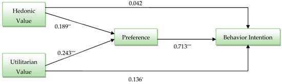 A Sobel test was carried out [61] in order to support the findings on mediating processes proposed by Baron and Kenny [62]. The Sobel test results showed that preference significantly mediates the relationship between utilitarian value and behavior intention (t-value = 3.375, p < 0.001).