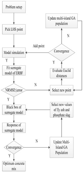 The multi-island GA method is combined with an adaptive surrogate modeling approach to achieve concrete mixture optimization. The concrete mixture optimization process is shown in Figure 2. The original sampling points are obtained by employing the LHS method. The results of the original sample point are used to construct the ERBF surrogate model. With regard to the convergence criterion, if the iteration converges based on the standard error measure, the surrogate model black box is constructed if the convergence conditions are met. Otherwise, new points are searched for using the adaptive sampling technique. The Euclidean distance between the new sample point and the selected sample point is assessed. If the iteration converges during the search for a new sample point, this point is appended to the model simulations; else, the population of the multi-island GA is updated. Iteration convergence indicates the end of the process or that the population of the multi-island GA has been updated.