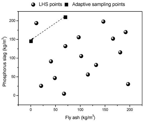 Before the optimization of the concrete mixture using the surrogate model, it is necessary to set up a black box. Fifteen original sample points for each concrete were selected using the LHS method. The new sample points were selected using the adaptive sampling method when the surrogate models did not reach a convergence tolerance of 0.02. The new sample points were placed in the sparsely populated area formed by the original sample points, thereby improving the veracity of the updated surrogate model. That is, the number of sampling points is minimized under the condition that the convergence tolerance of the adaptive surrogate model is a fixed value. Take into account these sample points, the specimens were poured (Figure 3a), placed in 20 °C and 95% RH curing tanks for 28 days (Figure 3b) and tested under various pressures, as shown in Figure 3c,d. The results showed that the adaptive surrogate model had a convergence tolerance of 0.02. 2, 2 and 3 new sample points were added for C70, C40 and C30 concrete respectively, the arrows indicated the order in which new sample points were obtained, as shown in Figure 4, Figure 5 and Figure 6. The sample points of the fly ash and phosphorus slag for the three types of concrete are listed in Table 4. When the total amount of cementitious material is constant, the replacement rate of cement with fly ash and phosphorous slag is within 38%.
