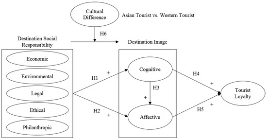 The perception of tourists varies depending on cultural differences [57,58]. Tourists from different countries place emphasis on varying aspects of services offered at the destination, and it is likely that they have different levels of satisfaction, even if experiencing the same service [57,59,60]. Therefore, understanding the tourists’ cultural backgrounds will help destinations design culture-oriented marketing and services [61,62,63]. There have been many studies examining differences in tourist perceptions and behaviors due to cultural differences [64]. Tourism motivations vary based on these cultural differences. You et al. [65] identified the difference between Japanese and U.K tourists using Dann’s push-and-pull theory. In an experimental study conducted by Levy [66], the overall satisfaction, word-of-mouth referrals, and the intention to repeat a visit also vary between Asians and Westerners. Tsang and Ap [67] identified the differences in relational quality experiences between Asian and Western tourists using Hofstede’s study. In a study by Kim and Malek [44], the relationship between the destination image and the tourist loyalty in Asian tourists were stronger than that of their Western tourists. However, the relationship that was apparent between the self-congruity and tourist loyalty was reversed. This is attributed to the preferences inherent between individualistic and collectivist cultures. In other words, Western tourists belong to a more individualistic culture, so they are more likely to be satisfied and loyal when they are allowed to do things themselves. Choi and Chu [68] also found that Asian and Western tourists place different importance levels on hotel service items. Asian tourists generally consider value for money to be the most important, while Western tourists consider it to be the room quality as the most important aspect. The hotel facilities also play a part in hotel satisfaction, with different amenities being valued based on different cultural demands [69]. In addition, there are also notable differences in services, brand personality perceptions, visit intentions, tourist satisfaction, tourist behaviors, etc., in terms of their cultural backgrounds [57,64,68,70,71]. DSR is defined as the collective activities of destination stakeholders to conduct socially responsible tourism [10,11]. The perception of what is DSR can vary depending on their culture. Different cultures show different degrees of importance on various components of DSR. These differences cause differences in the relationship between the destination image and tourist loyalty. Hence the hypothesis is as follows: