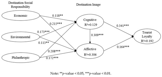 The total effects observed in the structural model are illustrated in Table 5. Every path showed statistically significant effects. Specifically, the philanthropic responsibility (β = 0.110, p < 0.01) among the three responsibilities had the greatest effect on tourist loyalty. The economic (β = 0.081, p < 0.01) and environmental (β = 0.086, p < 0.01) responsibilities had a similar scale effect on tourist loyalty. The influence of philanthropic responsibility (β = 0.208, p < 0.01) was the largest in the relationship between DSR and cognitive image, subsequently followed by environmental responsibility (β = 0.173, p < 0.01) and economic responsibility (β = 0.118, p < 0.05). The influence of economic responsibility (β = 0.251, p < 0.01) was greatest in the relationship between DSR and affective image, subsequently followed by the philanthropic (β = 0.236, p < 0.01) and the environmental responsibilities (β = 0.166, p < 0.01). In the relationship between destination image and tourist loyalty, the cognitive component (β = 0.392, p < 0.01) had a greater effect than the affective (β = 0.164, p < 0.01).