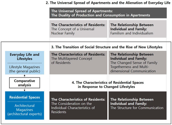 Section 3 was based on the previous studies of our researchers. In the case of architectural magazines, “Space”, the representative monthly architectural magazine of South Korea, was selected. The “Space Academia” section of this magazine was also listed in the A&HCI. “Space” magazine focuses on domestic architecture, providing monthly case studies of housing trends. In the analysis of architectural magazines, all case studies related to houses and housing in the last three years were surveyed. The logical connections between chapters are illustrated in