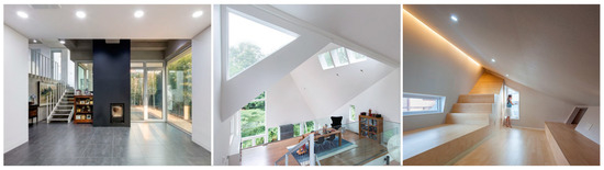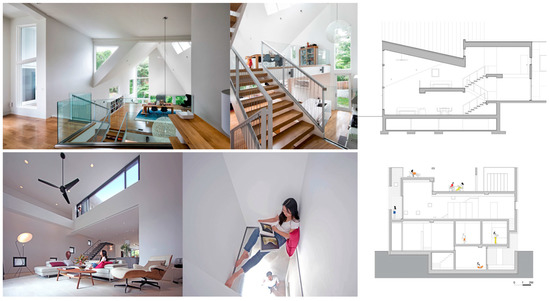 34]. Further, with such innovations as a glass floor on the second floor overlooking the entrance, the side window connecting the floor of the first-floor bedroom with the underground family room, and the rooftop looking down into a living room, this creates “a microscopic flow and continuity in the cross section and the house is filled with their spatial play” (