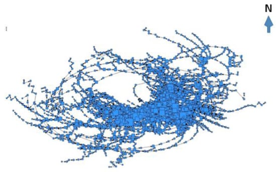 According to the above modeling method, all stations were numbered, and 0/1 adjacency matrix of was generated using Python, and UCINET and Netdraw drew the network topology map of the bus stations. Then, we performed the centrality analysis, selected “centrality measures” in the menu of “analysis”, and chose “degree” when setting the node size. The connection represents the direct connection between the sites. The size of the point reflects the importance of the node. The final bus network is visualized in Figure 1.
