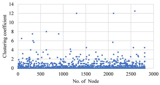 For the bus station network, the clustering coefficient reflects the intensity of the bus lines near each station, and the network is analyzed. The average clustering coefficient of the bus station network in Xi’an is , and the low clustering coefficient indicates less neighbor node connection. Therefore, when the traffic flow of neighbor nodes passes through the node, it is easy to cause the node to be heavily loaded and congested. Figure 3 presents the clustering coefficient value of different nodes.