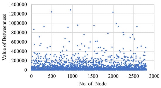 The betweenness of node is defined as the number of shortest paths passing through a node in the network, reflecting the impact of the node on the network. It is calculated that the minimum betweenness of the bus station in Xi’an is 0, the maximum is 1,283,175.750, and the average is 54,134.063, Figure 4 shows the betweenness value of different nodes.