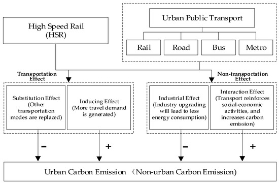 In terms of the non-transportation effects, HSR and other urban transport interacting with urban economic variables such as GDP, population or urban area size can affect urban carbon emission levels through synergizing these economic driving forces. Increases in these synergies (such as greater accessibility leading to lower travel times contributing to rises in commerce and trade that then lifts migration to suburbs) may lead to countervailing effects: (1) An industry effect may occur where carbon emission reductions outweigh an emission rebound effect. The industry effect refers to greenhouse gas emission reductions, where industry structure develops toward less carbon consuming activities. This occurs as upgrading industries toward a tertiary structure induces less energy and discharges less carbon emissions than heavy manufacturing. (2) An interaction effect may also occur when transportation development reinforces socio-economic development through interactions with GDP or the population, inducing more economic activities, and carbon consumption [59,60]. We illustrate these relationships in Figure 1.