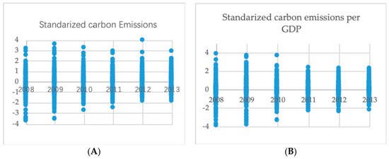 Figure 2A,B present a scatterplot of the 194 cities from 2008–2003, where we plot two of our dependent variables, standardized carbon emissions and standardized carbon emissions per GDP. Figure 2A shows considerable variation across time and a modest upward trend. Most of the variation in carbon emissions is across cities, not across time. Figure 2B also displays substantial variation across cities and no upward trend. Our regressions demonstrate that GDP is a very significant determinant of overall carbon emissions; however, 2B illustrates that even after adjusting for GDP, other factors determine carbon emissions across cities. These factors are likely differing transportation modes, industrial structures and additional economic factors not captured directly by GDP.