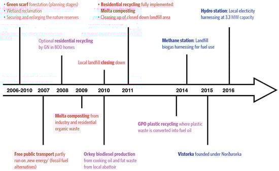 In 1999, the municipality started drawing its local Agenda 21. This engagement with sustainability issues laid the foundation for all subsequent environmental policies. Following this, municipal bodies, local utilities, and private companies initiated a multitude of local environmental projects. An overview of these projects can be found in Figure 1. Nowadays, the political heart of the transition is the “carbon neutral Akureyri strategy” (in this article hence given the acronym CNAS). The CNAS is part of the municipality’s Environment and Transport Policy from 2016.