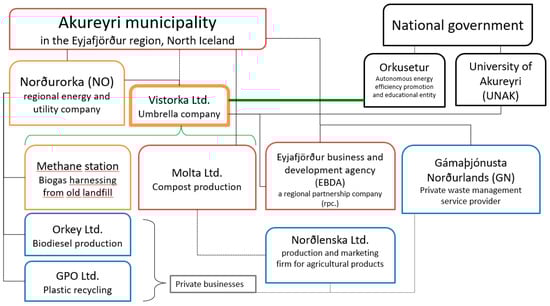 The main actor to coordinate and drive the transition in Akureyri is the company Vistorka. Founded in May 2015, Vistorka is a Ltd. company owned by Norðurorka PLC (hence, NO), the local energy and utility company which is, in turn, largely owned by the Akureyri municipality (see Figure 2). Two locals developed the concept of Vistorka, Guðmundur Haukur Sigurðarson (hence referred to as Guðmundur), now the CEO of Vistorka, and Sigurður I. Friðleifsson (hence referred to as Sigurður), now a board member of Vistorka. From 2007 onwards, Guðmundur was involved in the design and development of many projects that are now part of the CNAS. At this time, he worked for an engineering firm which worked as a contractor for many of the projects. Many of these projects became part of Vistroka when the company was founded in 2015. His previous involvement in, and inside knowledge of, several of the projects in Akureyri made him an ideal candidate to lead an organisation that aimed to bring different transition projects together under one umbrella organisation. Sigurður is the CEO of a public institute called Orkusetur. This independent and autonomous entity promotes and assists energy efficiency projects, explores new concepts for energy production, and provides educational material. The institute has a nationwide focus, but its office is located in Akureyri.