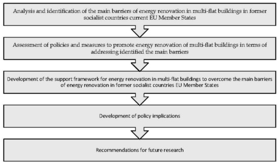 The critical review of recent scientific literature in the field of energy renovation of multi-flat buildings is the main method applied in this review paper. The applied method in this paper consists of the following steps (Figure 1): Analysis and identification of the main barriers of energy renovation in multi-flat buildings in former socialist countries that are current EU Member States; Assessment of policies and measures to promote energy renovation of multi-flat buildings in terms of addressing the identified main barriers; Development of the support framework for energy renovation in multi-flat buildings to overcome the main barriers of energy renovation in former socialist countries that are EU Member States; Development of policy implications; Recommendations for future research.