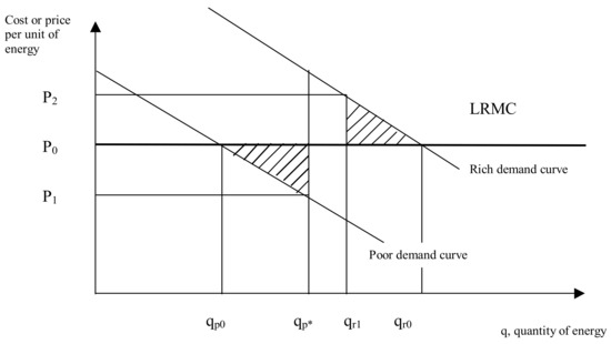 The welfare costs of our proposed scheme are provided in Figure 2 which assumes two block rates, with the higher rate being set so that the utility recovers the full cost of the service. There are two categories of consumers: “poor” and “rich”. With the price of energy equal to the LRMC, poor households consume qpo and rich households qro. The solution is efficient in the sense that consumer surplus is maximized and no households can be made better off without some other households being made worse off. In economic terminology the solution is ‘Pareto efficient’.