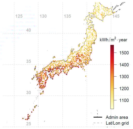 The global horizontal irradiance (GHI) and diffuse horizontal irradiance (DHI) are the required inputs for determining the optimal orientation and tilt angle. GHI and DHI for locations across Japan were obtained from Japan’s New Energy and Industrial Technology Development Organization (NEDO), using meteorological test data for photovoltaic systems (METPV-11) []. The dataset consists of post-processed hourly meteorological data for a 1-year period (similar to a typical meteorological year dataset) at 837 locations extracted from ground measurements spanning 20 years (1990–2009). Similar to typical meteorological year (TMY3) data from the National Solar Radiation Data Base (NSRDB), METPV11 data accurately represent the long-term solar resource distribution across Japan. To promote ease of use of the data for different sites in Japan, NEDO provides a user-friendly web interface app []. The locations covered in this study are shown in Figure 1, whereby each colored pixel denotes a station, with the color indicating the annual solar irradiation.