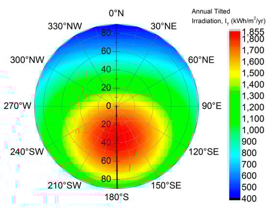 In the real world, the ultimate parameter of interest is the energy output of the PV systems. To accurately calculate the energy output, many loss mechanisms have to be included, as shown in a detailed model by King et al. []. To simplify the modeling, the optimal orientation and tilt angle was determined solely from the annual tilted irradiation received by the PV modules. This approach is reasonable because a PV system’s electrical output is proportional to the annual irradiation it receives.