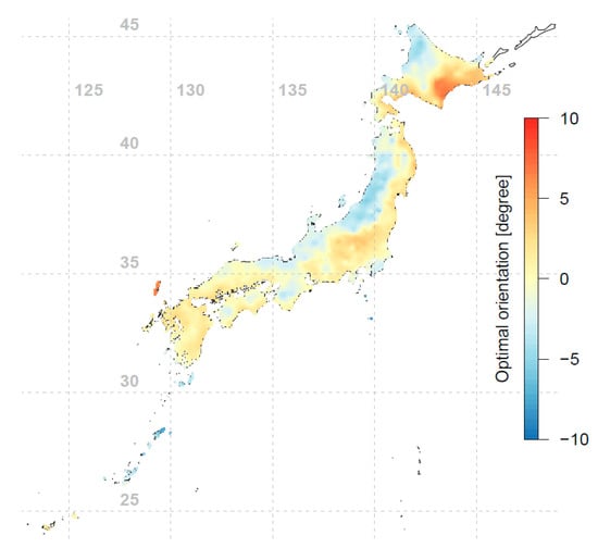 Optimal orientations for fixed-tilt PV modules in Japan (interpolated using 837 data points). The results are represented as the deviations from the south orientation. A negative (positive) angle means that the module faces slightly eastwards (westwards).