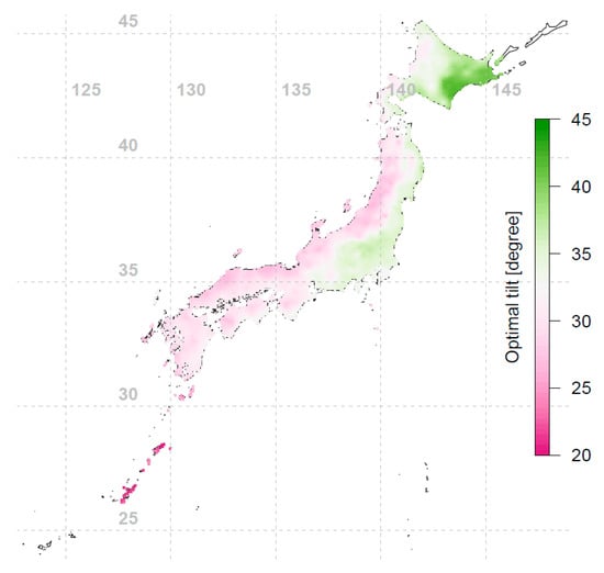 Optimal tilt angles for fixed-tilt PV installations in Japan (interpolated using 837 data points).