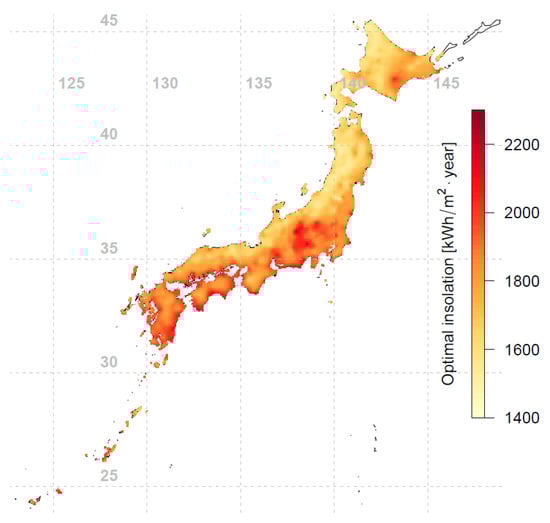 After the Fukushima nuclear disaster in 2011, the Japanese government announced plans to expand the solar photovoltaic (PV) installations to reduce reliance on nuclear power. Following the implementation of Japan’s renewable energy feed-in-tariff (FIT) scheme in July 2012, photovoltaic (PV) installation has grown rapidly []. In this paper, the optimal orientation and tilt angle for maximizing in-plane solar irradiation in Japan was studied to understand the potential of PV adoption in Japan.